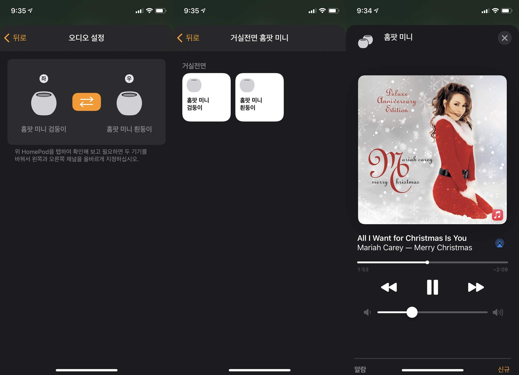 홈팟 미니 2대를 스테레오로 설정하여, 크리스마스 캐럴을 들어 보았는데 확실히 음질이 좋아서,