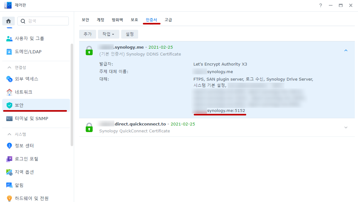 시놀로지 '제어판-보안-인증서'에 'xxxxxx.synology.me:5152'가 들어가 있는 것이 보인다.