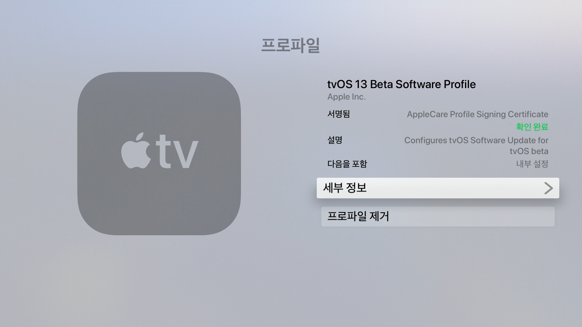 tvOS 13 Beta Software Profile을 다운로드하여 OTA로 간단하게 설치를 하였다.
