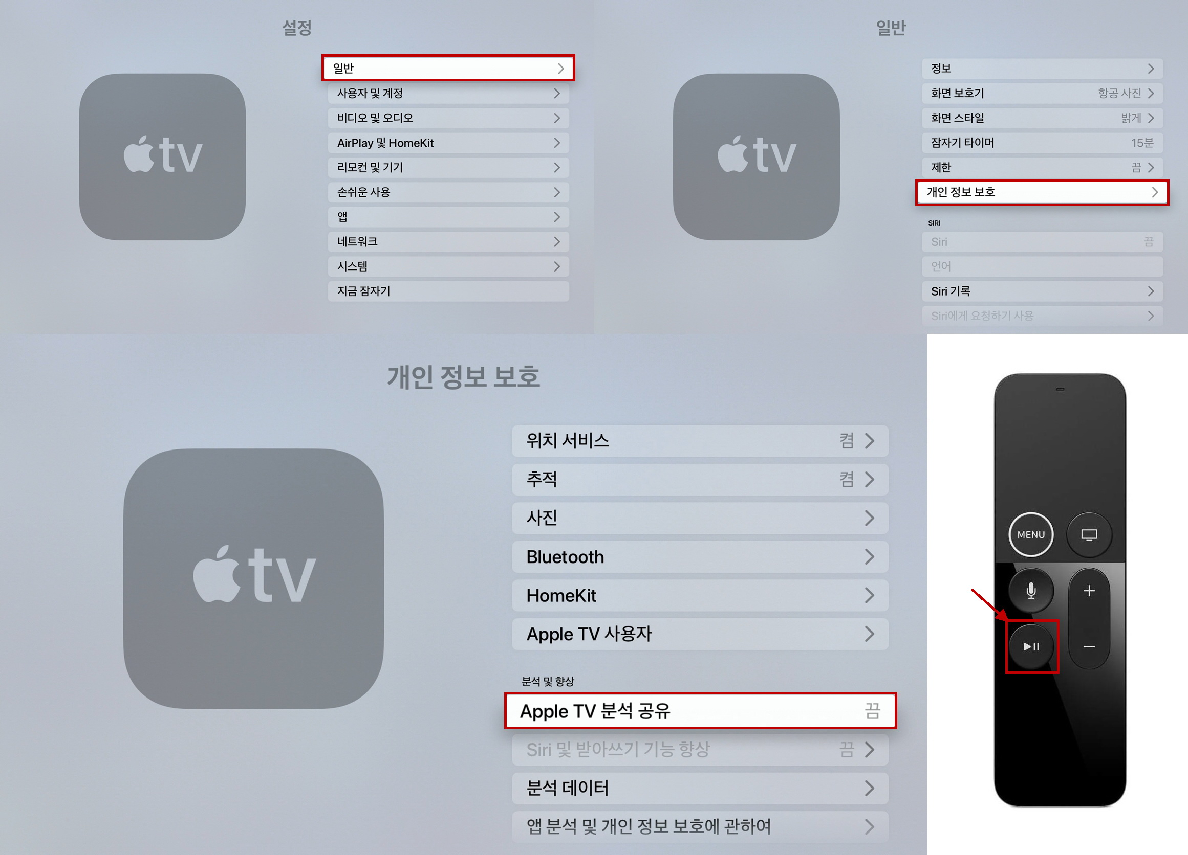 설정의 '일반-개인 정보 보호-Apple TV 분석 공유'에서 애플 티비 리모컨의 'Play/Pause' 버튼을 누르면,