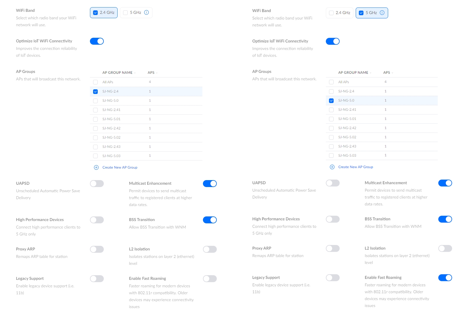 고속 이동형 디바이스들이 사용하는 5.0 Ghz는 Fast Roaming (802.11r) 옵션을 활성화시켰다.
