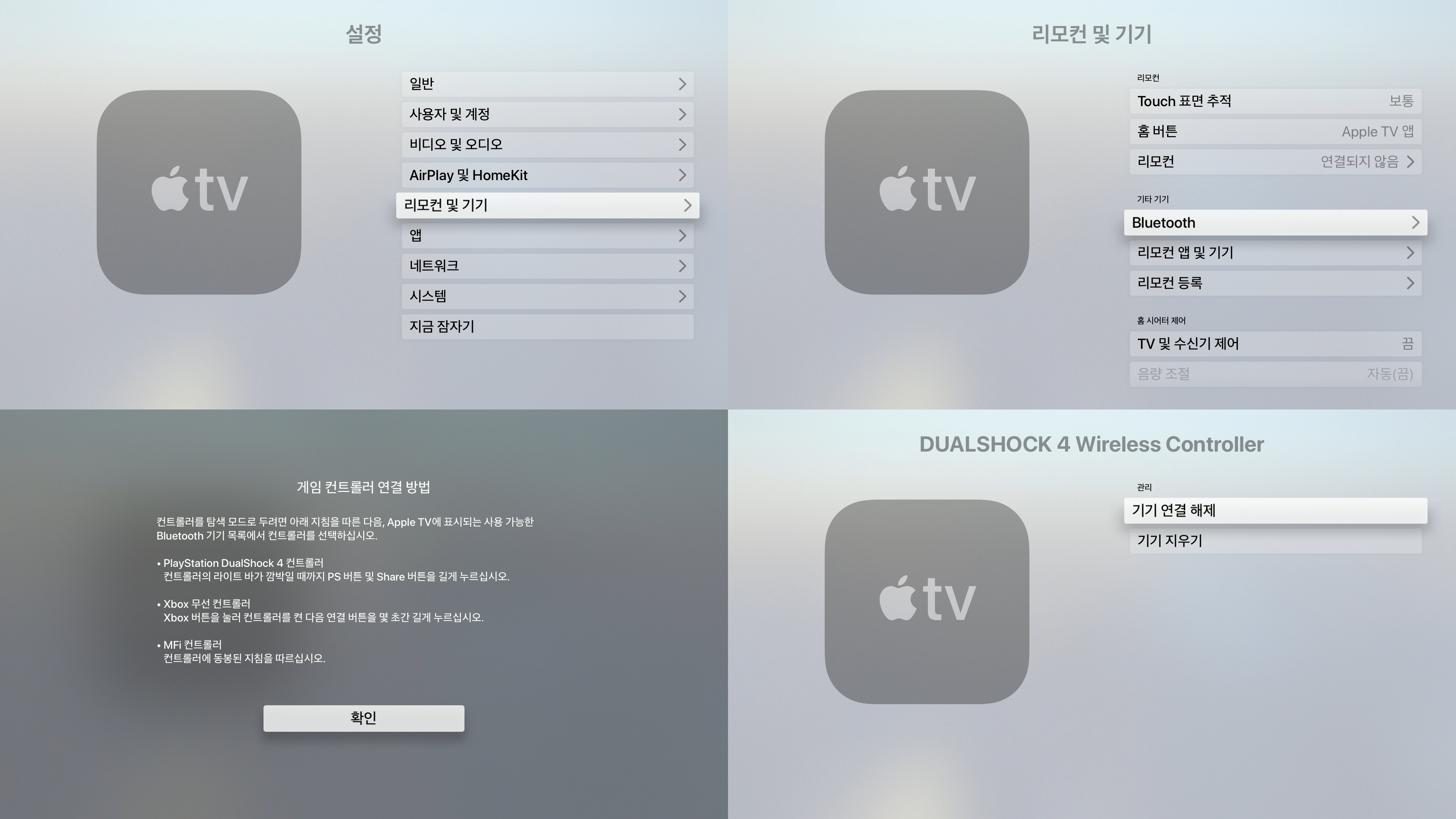 애플티비의 [설정->리모컨 및 기기->Bluetooth]에서 듀얼쇼크 4의 'PS 버튼'과 'Share 버튼'을