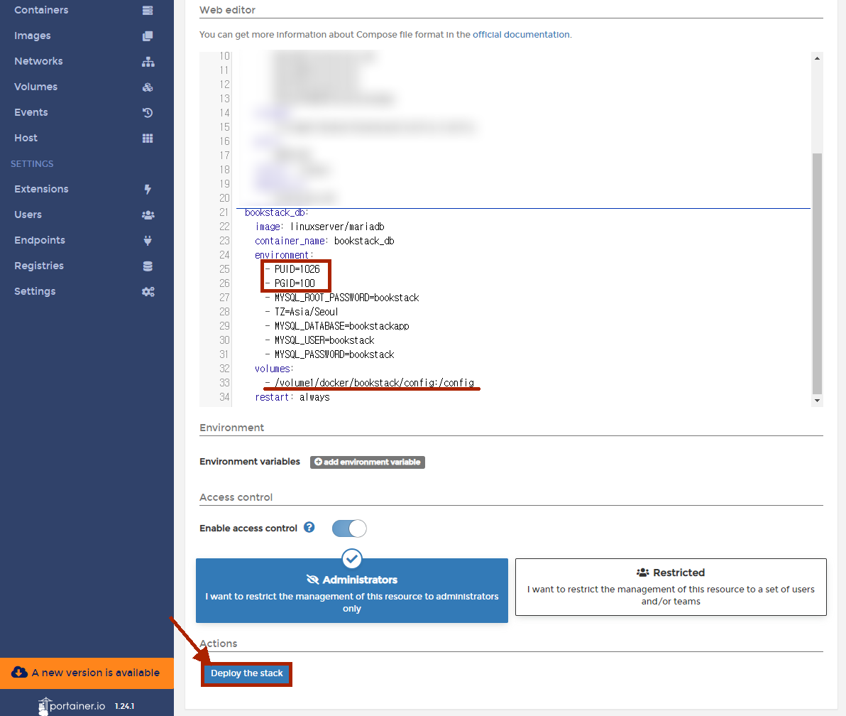 이름에 "bookstack"을 입력하고, Web editor에 코드 블럭을 붙여넣기(Ctrl-V)한 후,