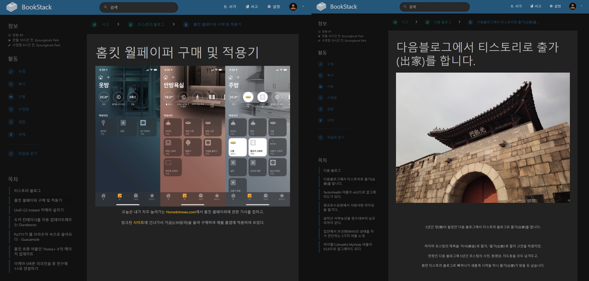 오픈 소스 솔루션인 BookStack은 평판도 좋고, 한글화도 되어 있고, 사용법도 간단해서,